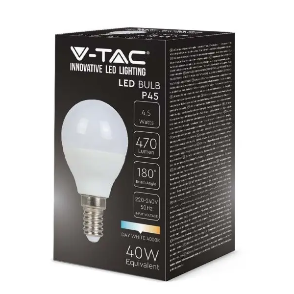Lampadina LED minibulbo P45 con attacco E14, potenza 4.5W bianco naturale.